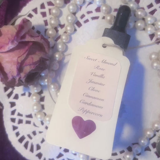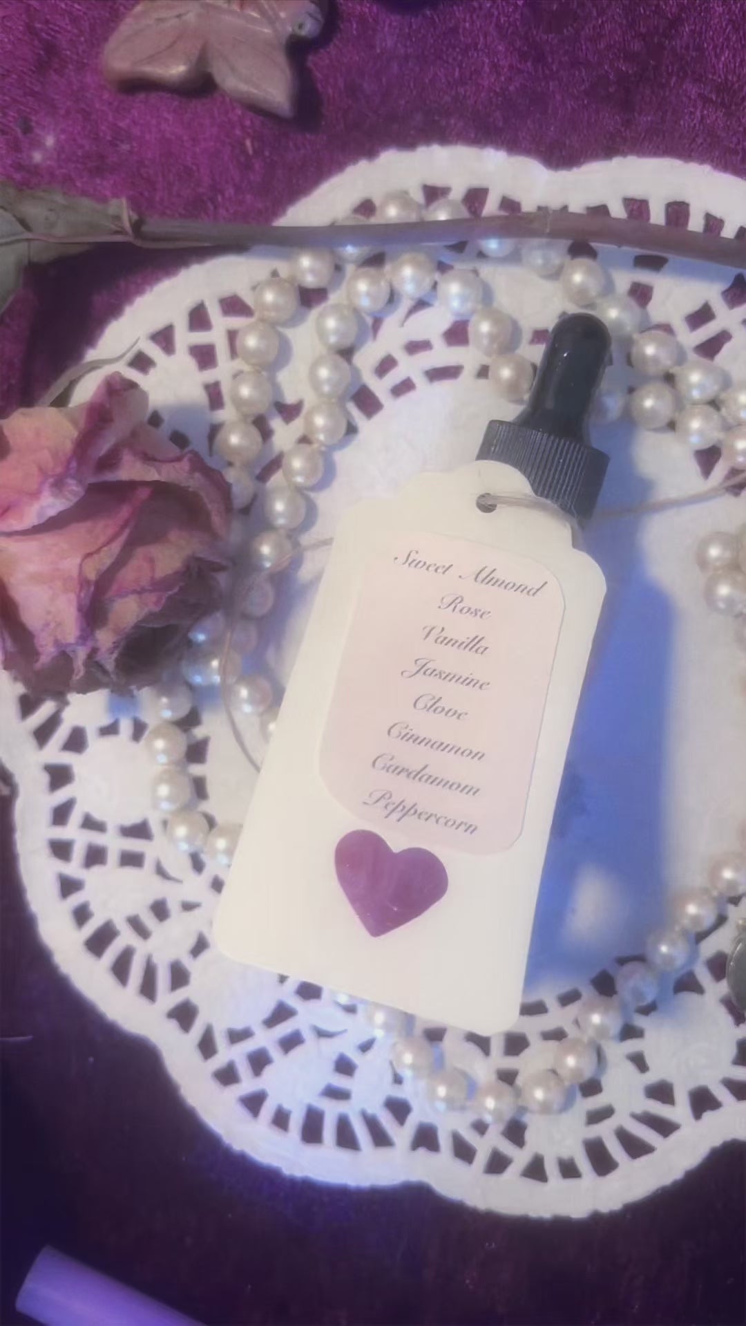 Sweet Almond Oil, Rose, Vanilla, Jasmine, Clove, Cinnamon, Cardamom, Peppercorn, Pink Mica Powder with Glitter (SEPARATION IS NATURAL) Shake to mix!